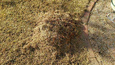 収穫したサッチがこれだけ。今回は軽く掻きだしただけですが結構ありますね。サッチは乾燥しにくく、病原菌の巣になったり、藻が生えたりと芝生のトラブルの原因となるのでなるべく取り除くようにしたいのですが、サッチングマシーンのモチベーションが切れてしまったので作業はここで終了しました。